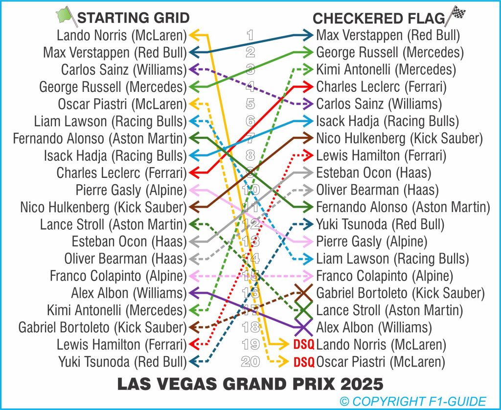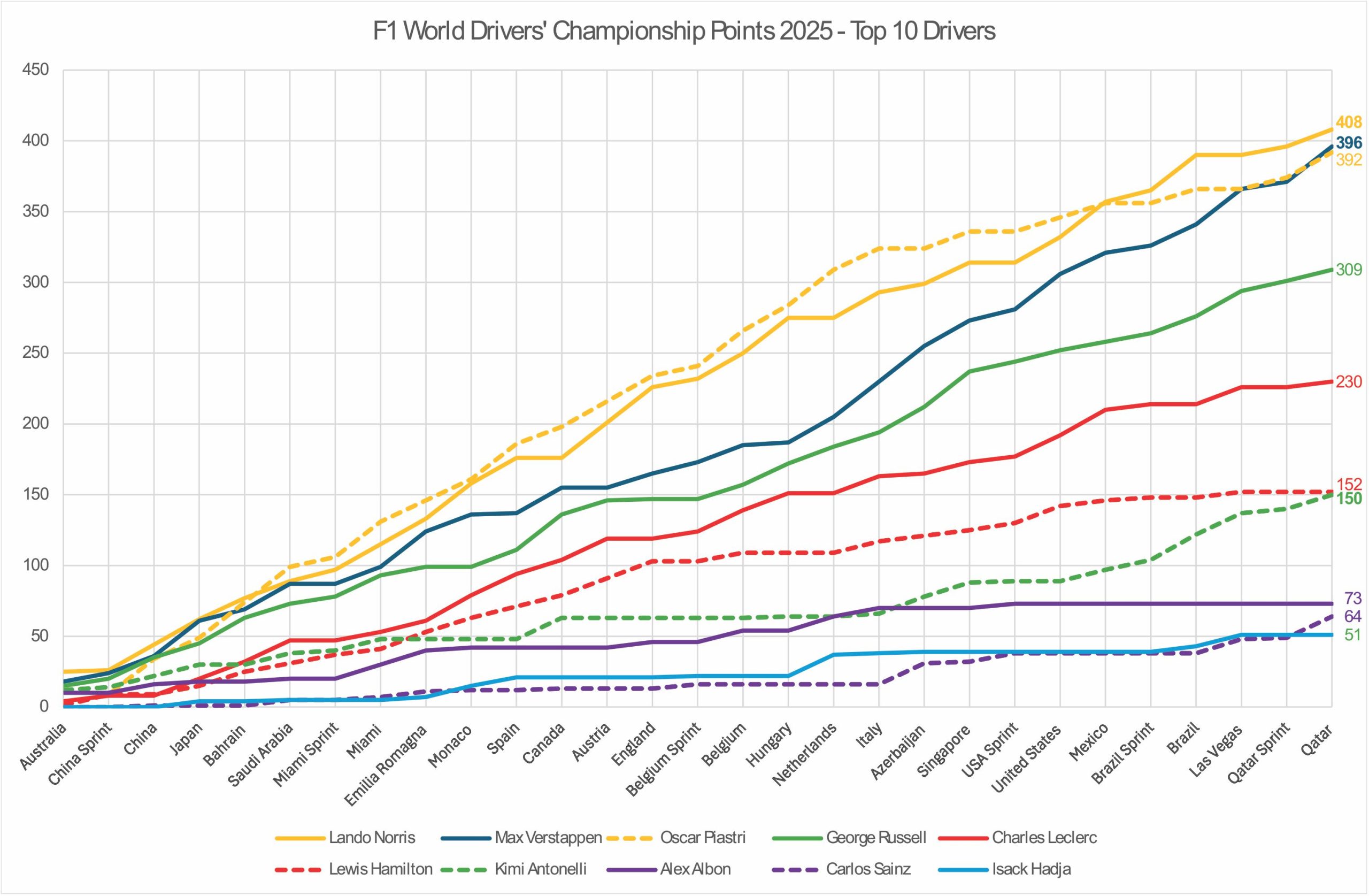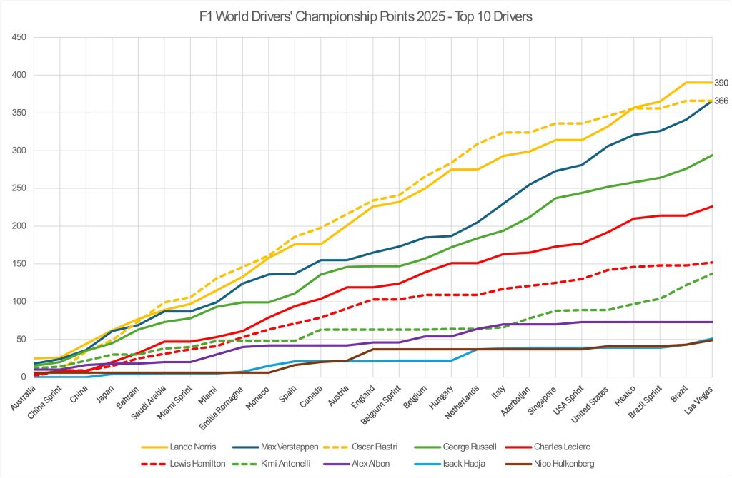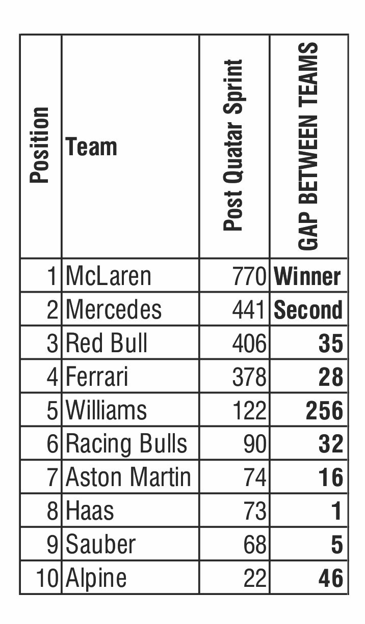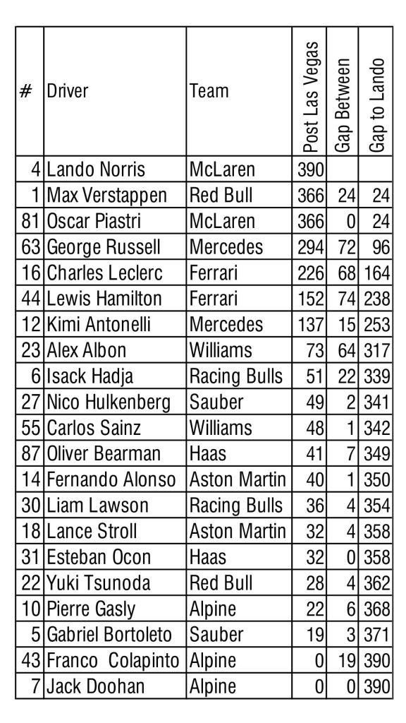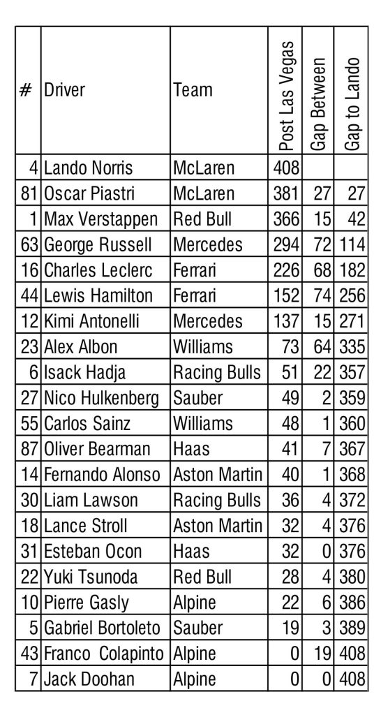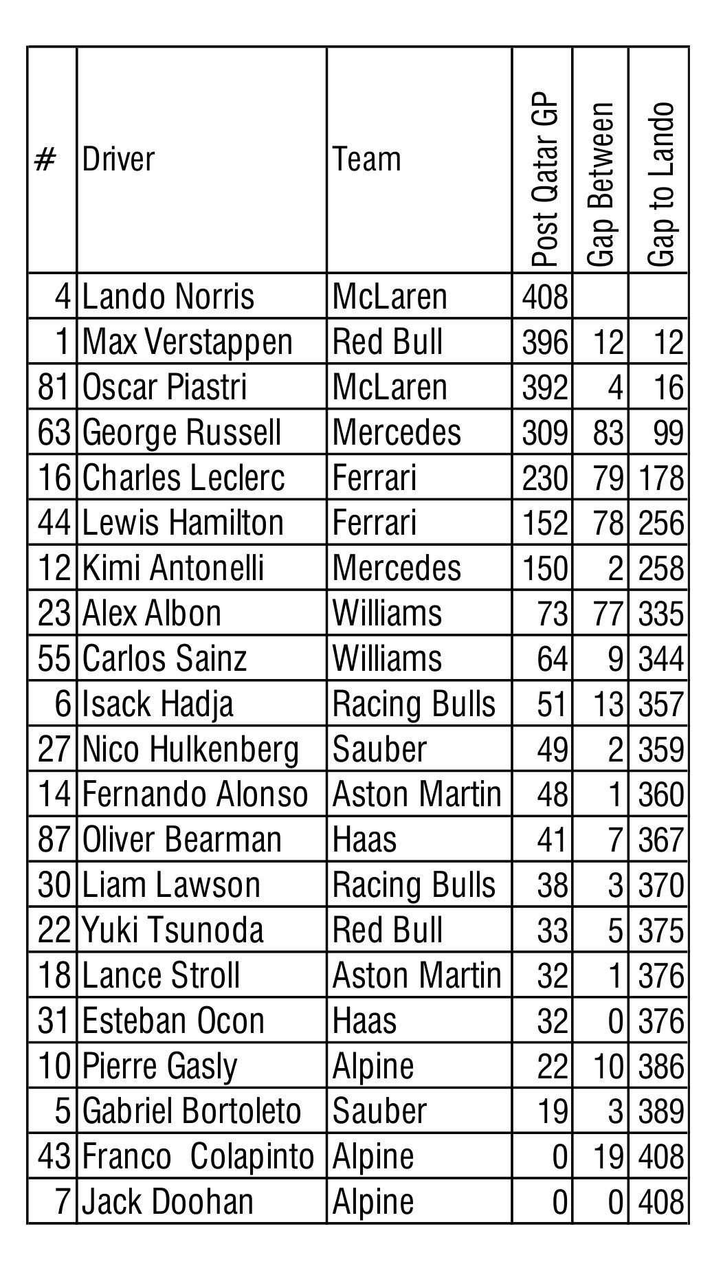 The World Drivers’ Championship points for 2025 post Qatar-