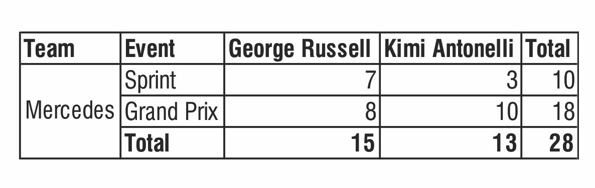 Mecedes did well over the weekend. George Russell’s fifteen points and Kimi Antonelli’s thirteen kept then ahead of Red Bull.