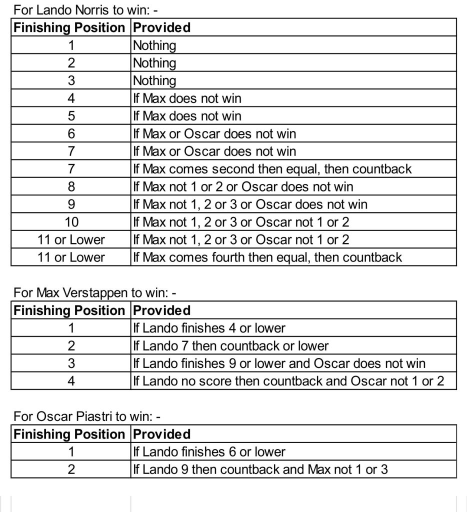 Much has been written about McLaren not pitting their cars under the safety car while every other team pitted their cars. But could they? Andrea Stella, Team Principle, said that they could not under their driver fairness principle, “papaya rules”, as that would have compromised one or other of their drivers. I think they could have pitted both. Oscar Piastri was ahead of Max Verstappen with Lando Norris in third with a gap of 5.513 seconds between Oscar and Lando. McLaren’s pit crew are slick with the fastest car stationary time of 1.8 seconds and nearly always below 3 seconds. If Oscar had pitted first, Lando would not be double stacked for long and provided his tyres were near the pit box he would not have lost much time and probably not the third place.