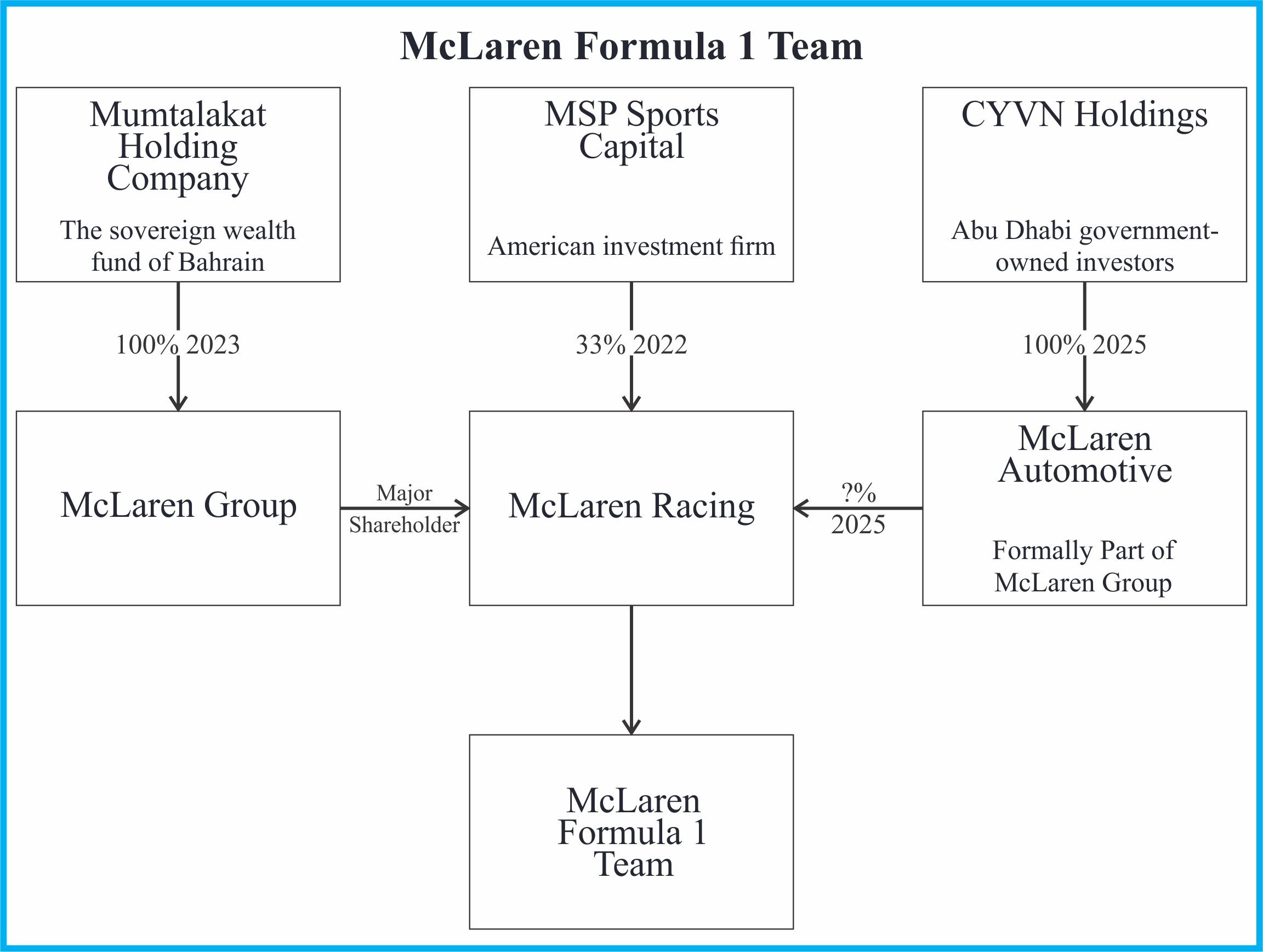 MSP Capital came to the rescue purchasing a 15% share in McLaren Racing or the McLaren Group, who then owned 100% of McLaren Racing. They raised this shareholding to a third in 2022. CYVN bought McLaren Automative which in its turn had a minority shareholding in McLaren Racing.