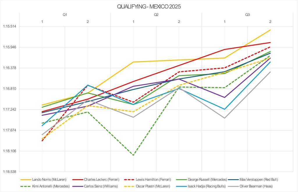 After that it was Lando Norris (McLaren) all the way except for the first fast run in Q2 when Charles Leclerc (Ferrari) put in a time of 1m15.991s, the first time under 1m16s, 0.179 seconds faster than Lando.