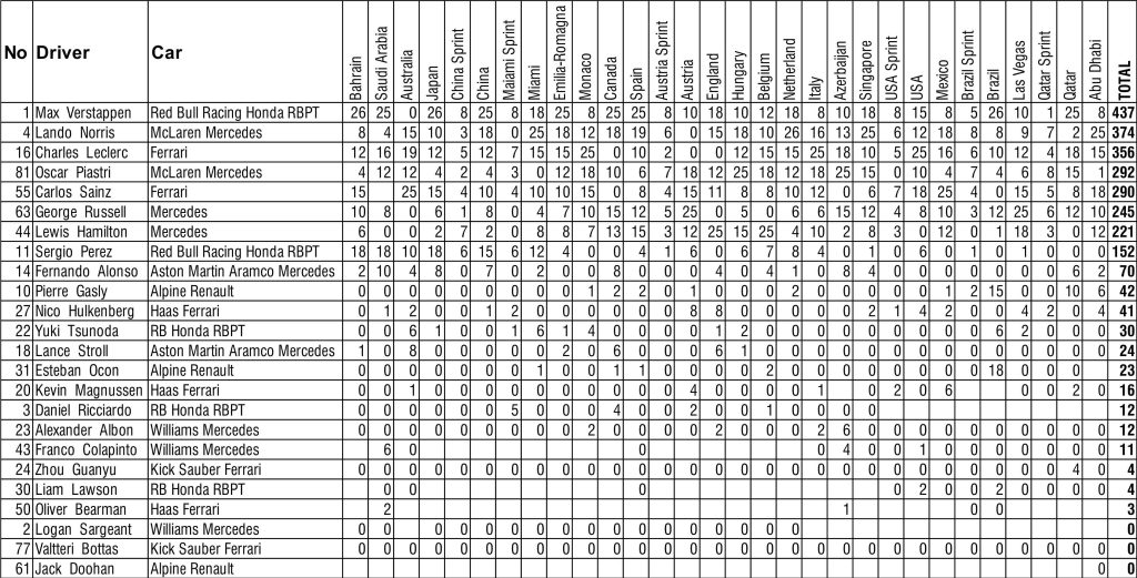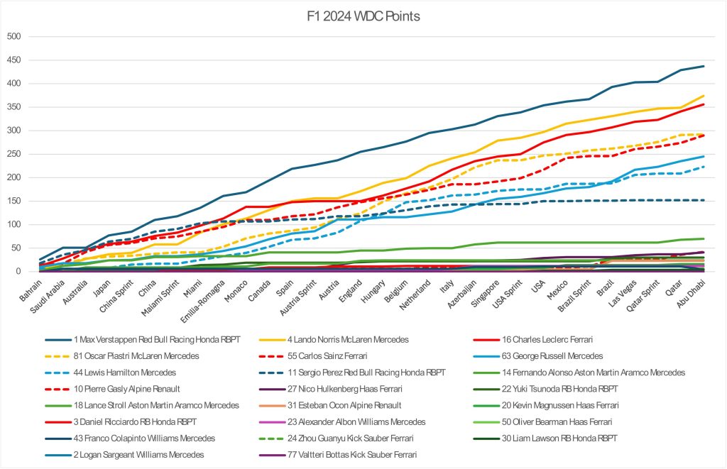 The graph shows that Red Bull were dominate in the early season up to and including Miami with Max and Segio 1st and 2nd respectively. Sergio Perez fell off at this point to end the season 8th. This gave rise to Sergio being let go by Red bull at seasons end and not on the grid for 2025. I hope that the rumors floating around are correct and that Sergio will be on the 2026 grid with Cadillac. The two McLaren drivers were split by Charles Leclerc (Ferrari) who ended 3rd with Lando Noris and Oscar Piastri achieving 2nd and 4th respectively. The other Ferrari driver, Carlos Sainz, was placed 5th in the WDC just 2 points behind Oscar. For the 2025 season Carlos lost his seat to Lewis Hamilton but will be racing for Aston Martin. The Mercedes duo of George Russell and Lewis Hamilton started the season with a car that just did not have the pace to compete. This improved markedly from Spain onwards though not enough to win events. They ended with George 6th and Lewis 7th. Fernando Alonso (Aston Martin) finished 9th and is clearly the best of the rest.