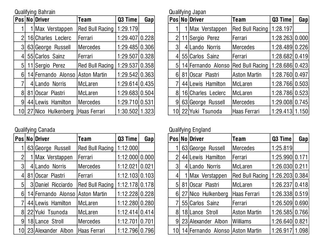 What a season of racing F1 2024 produced. In the penultimate season of the current regulations, it was expected that the cars would converge in performance and at least the best ones did. See how close the top cars were to each other in these Qualification times where the gap time is to the position 1 time