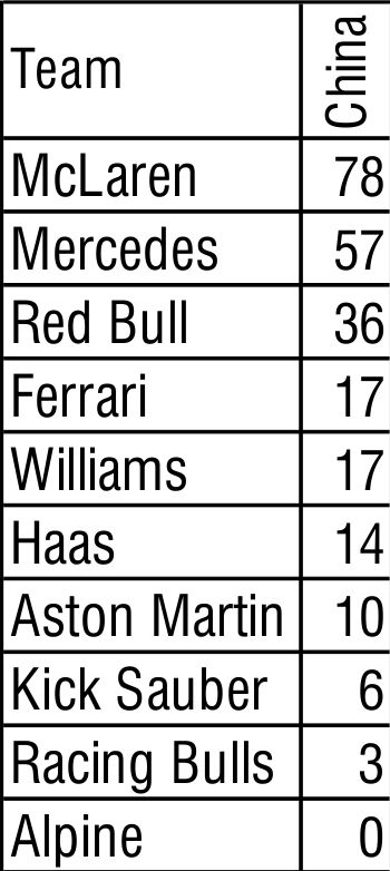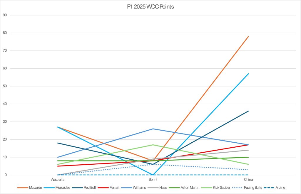 After 3 scoring events and 2 GP weekends how do we stand? McLaren are showing that in this early part of the season they are the team to beat. Without the very expensive mistake in the wet in Australia where Oscar Piastry dropped himself from second to almost last. He did recover a bit to get 2 points instead of his expected 18 or more.